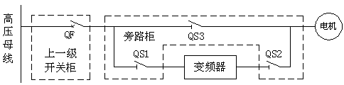 3、QS1、QS2閉合時(shí),QS3斷開(kāi)時(shí),QF閉合時(shí),電機由變頻器控制調速運行。QS1斷開(kāi)、QS2斷開(kāi)、QS3閉合時(shí),電機可由QF直接啟停并進(jìn)行保護,變頻器可完全和電網(wǎng)脫離,便于維護與檢修。