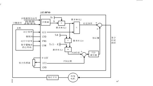 由代表生產(chǎn)紙線(xiàn)速度的主機(四缸或壓光機變頻器)運行頻率和卷繞紙張的實(shí)時(shí)卷徑計算出相應的從機(卷取機)主給定頻率,以此作為前饋;同時(shí)用PID調節器控制紙張的張力PID輸出,對給定頻率進(jìn)行不斷修正,將修正后的頻率作為卷取電機的給定頻率。這種前饋和反饋共用的復合控制方法控制精度很高,很多張力控制專(zhuān)用的變頻器都使用了這種方法。而SB70G可以通過(guò)可編程模塊來(lái)編程實(shí)現這種控制,使用方便,方法靈活。系統控制框圖如下: