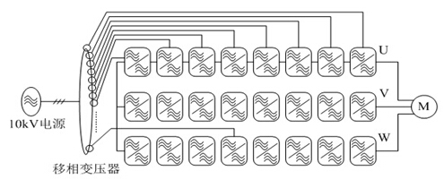 SBH系列高壓變頻器采取的拓撲結構方式為單元串聯(lián)型高壓變頻器,其為直接高-高變換電壓源型,變頻器基本原理如下圖2所示:
