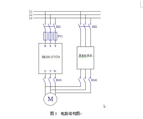 在原電機與開(kāi)關(guān)之間增加一套變頻裝置,并保留了原有工頻回路做旁路,其電路結構圖如圖1所示。