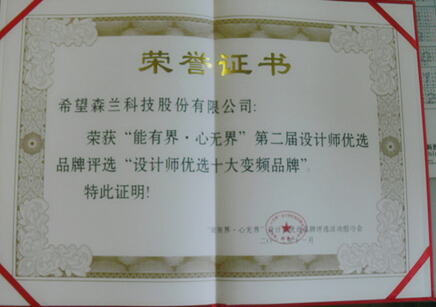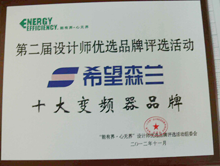 2012年11月30日,在北京舉行的第二屆設計師優(yōu)選品牌評選活動(dòng)上,森蘭變頻器憑借過(guò)硬的產(chǎn)品質(zhì)量和良好的市場(chǎng)口碑,榮獲““設計師優(yōu)選十大變頻品牌”的稱(chēng)號。